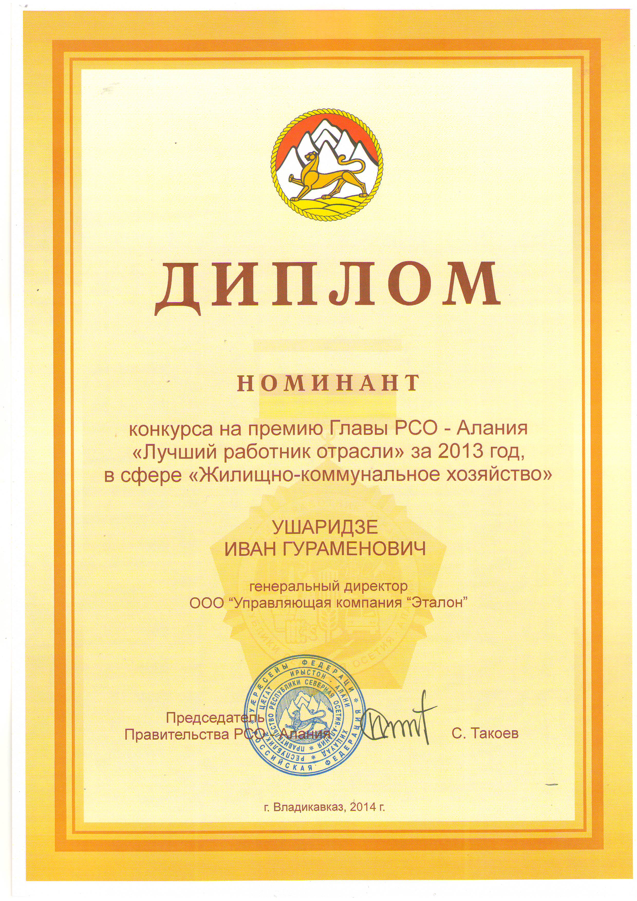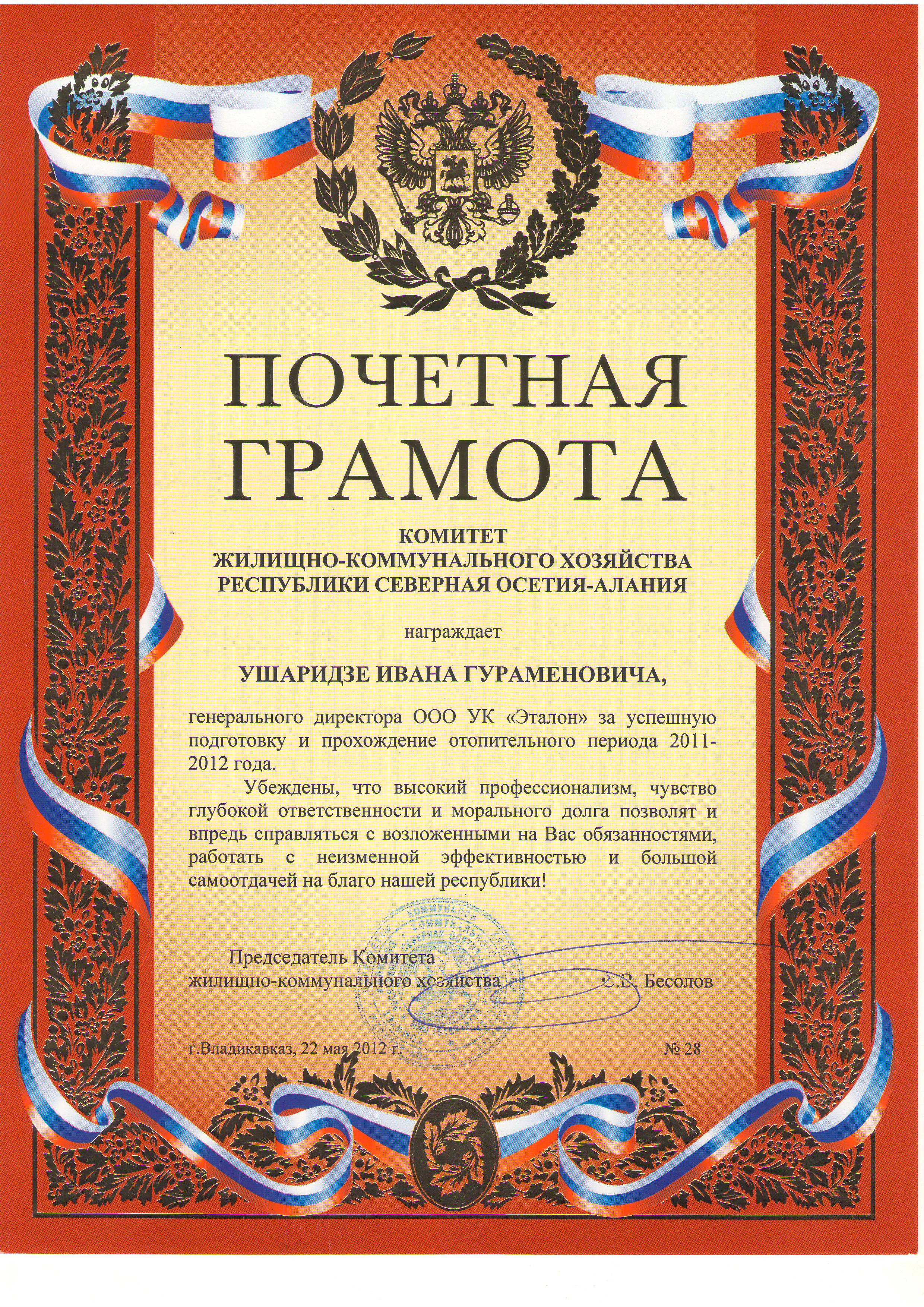 Май 2012 года – Генеральный директор ООО УК «Эталон» УШАРИДЗЕ Ивана Гураменовича награждается Почетной грамотой Комитета жилищно-коммунального хозяйства Республики Северная Осетия - Алания за успешную подготовку и прохождение отопительного периода 2011-2012гг.