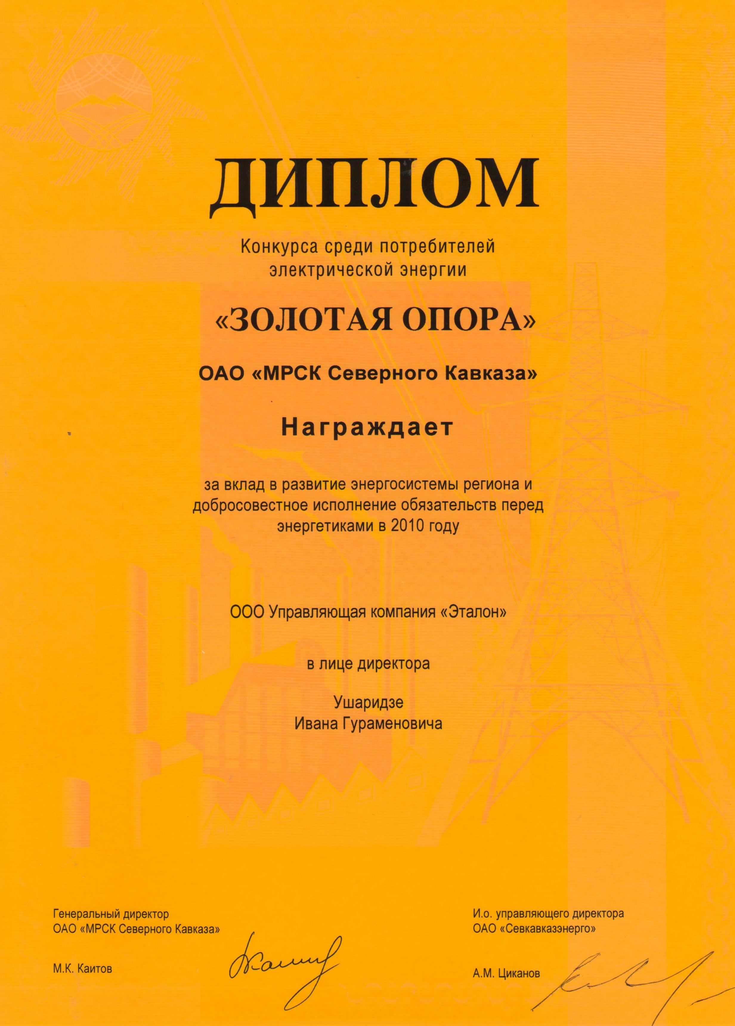 Апрель 2011 года – Общество с ограниченной ответственностью Управляющая компания «Эталон» лауреат регионального конкурса «Золотая опора». Конкурс «Золотая опора» инициирован по всей стране РАО «ЕЭС России», в рамках которого гарантирующие поставщики электрической энергии ежегодно определяют 12 победителей в четырёх номинациях: промышленные предприятия; предприятия, финансируемые за счёт средств бюджета; предприятия сельского хозяйства; предприятия малого бизнеса.