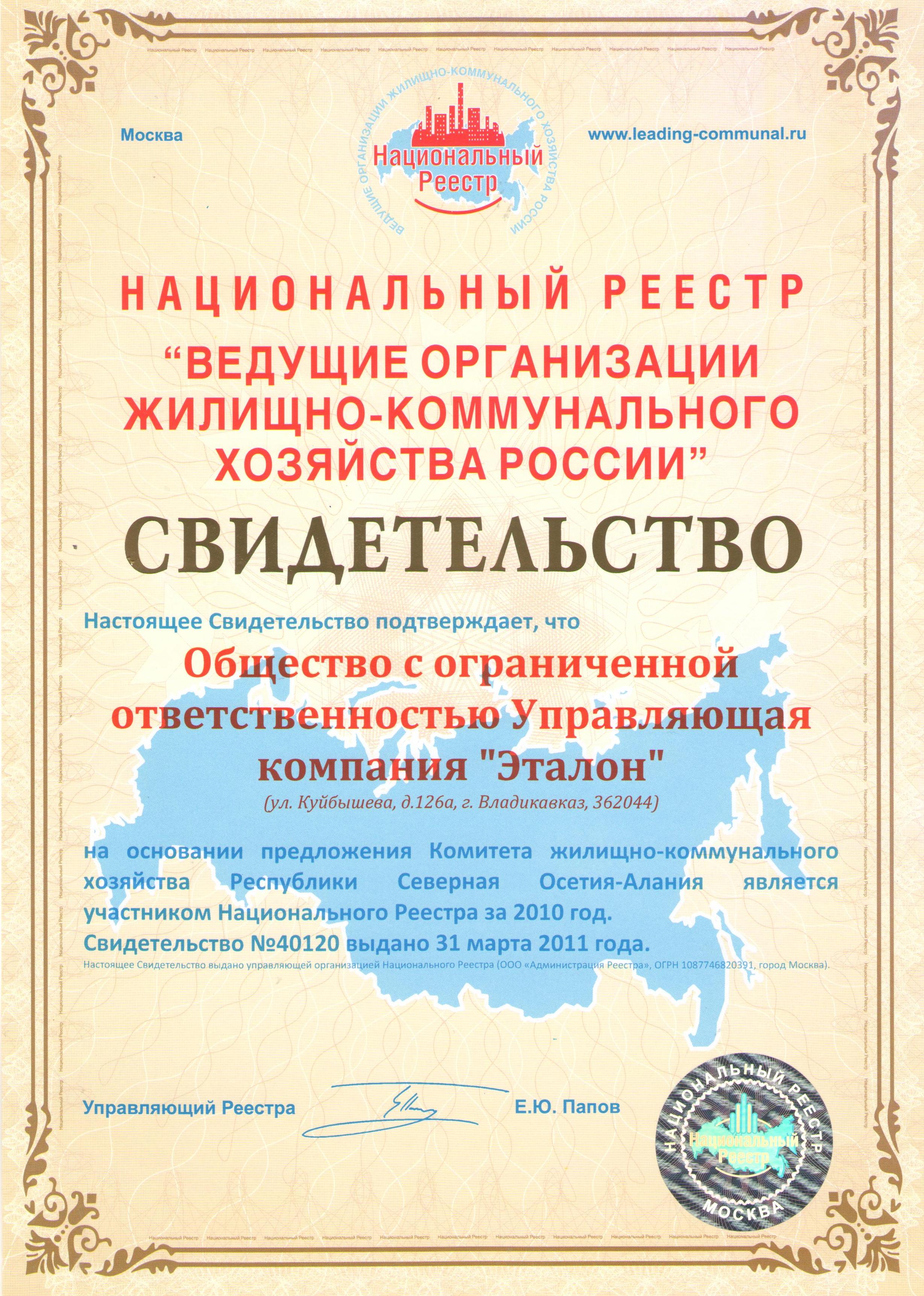 Март 2011 года – Общество с ограниченной ответственностью Управляющая компания «Эталон» включено в Реестр ведущих организаций жилищно-коммунального комплекса за 2010 год.