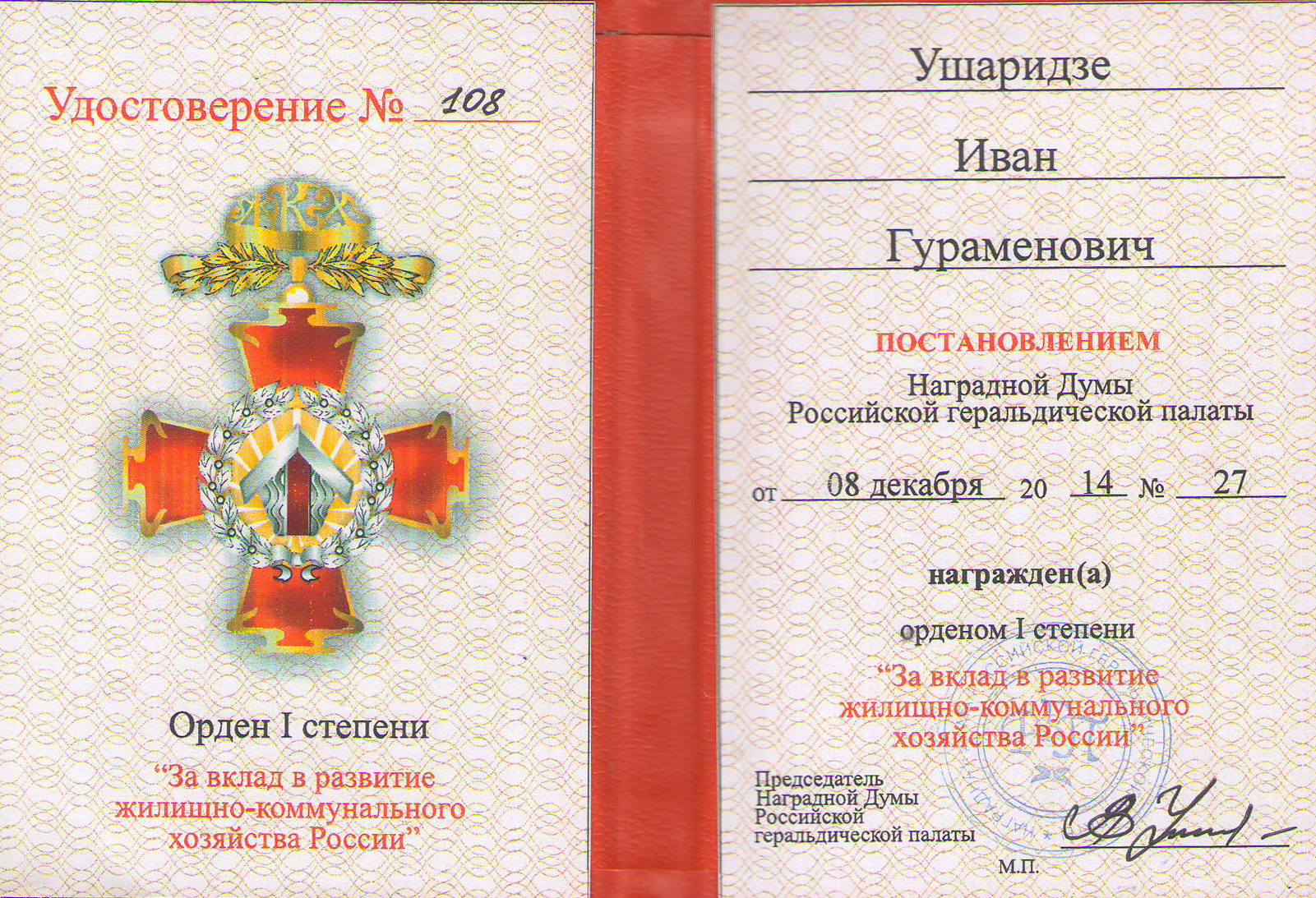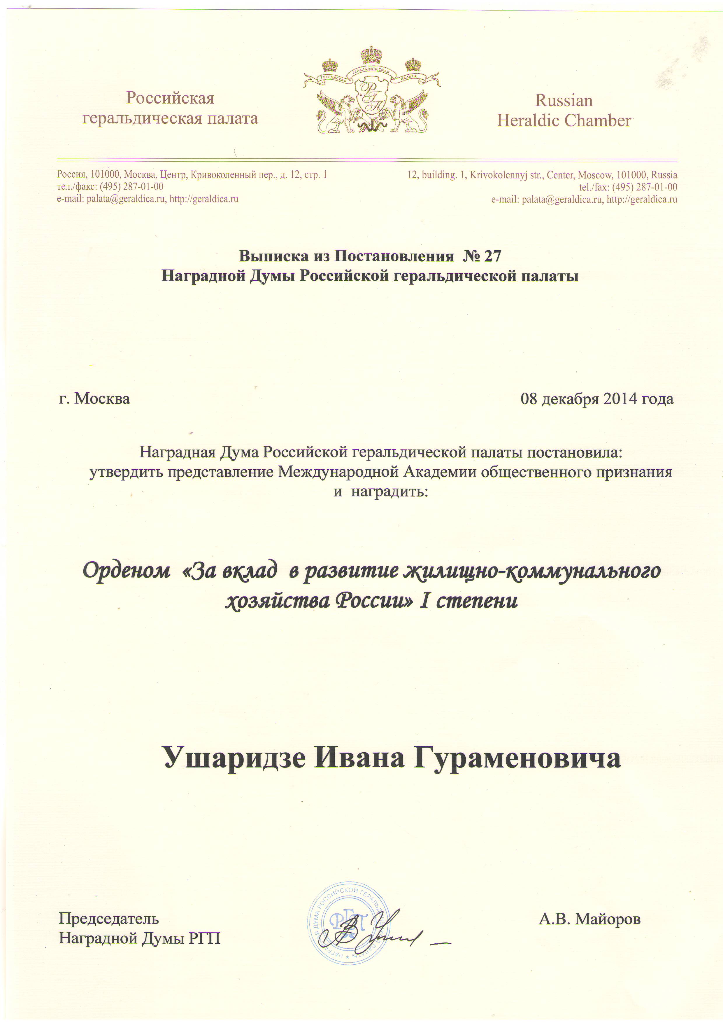 Декабрь 2014 года – Постановлением Наградной Думы Российской геральдической палаты представлен к награде орденом "За вклад в развитие жилищно-коммунального хозяйства России" I степени генеральный директор ООО УК "ЭТАЛОН" УШАРИДЗЕ Иван Гураменович.