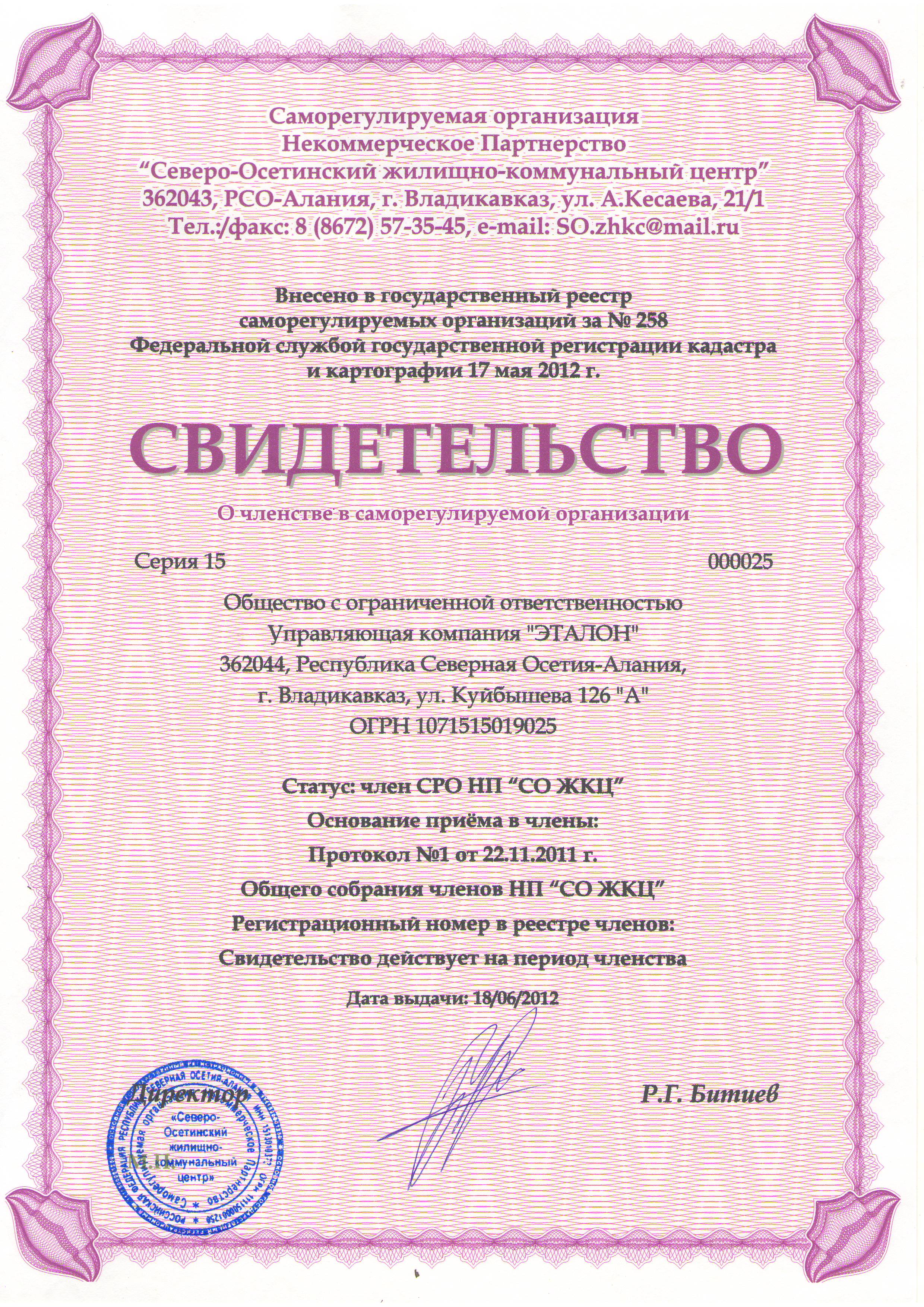 Май 2012 года – Общество с ограниченной ответственностью Управляющая компания «Эталон» внесено в государственный реестр саморегулируемых организаций за № 258 Федеральной службой государственной регистрации кадастра и картографии 17.05.2012г.