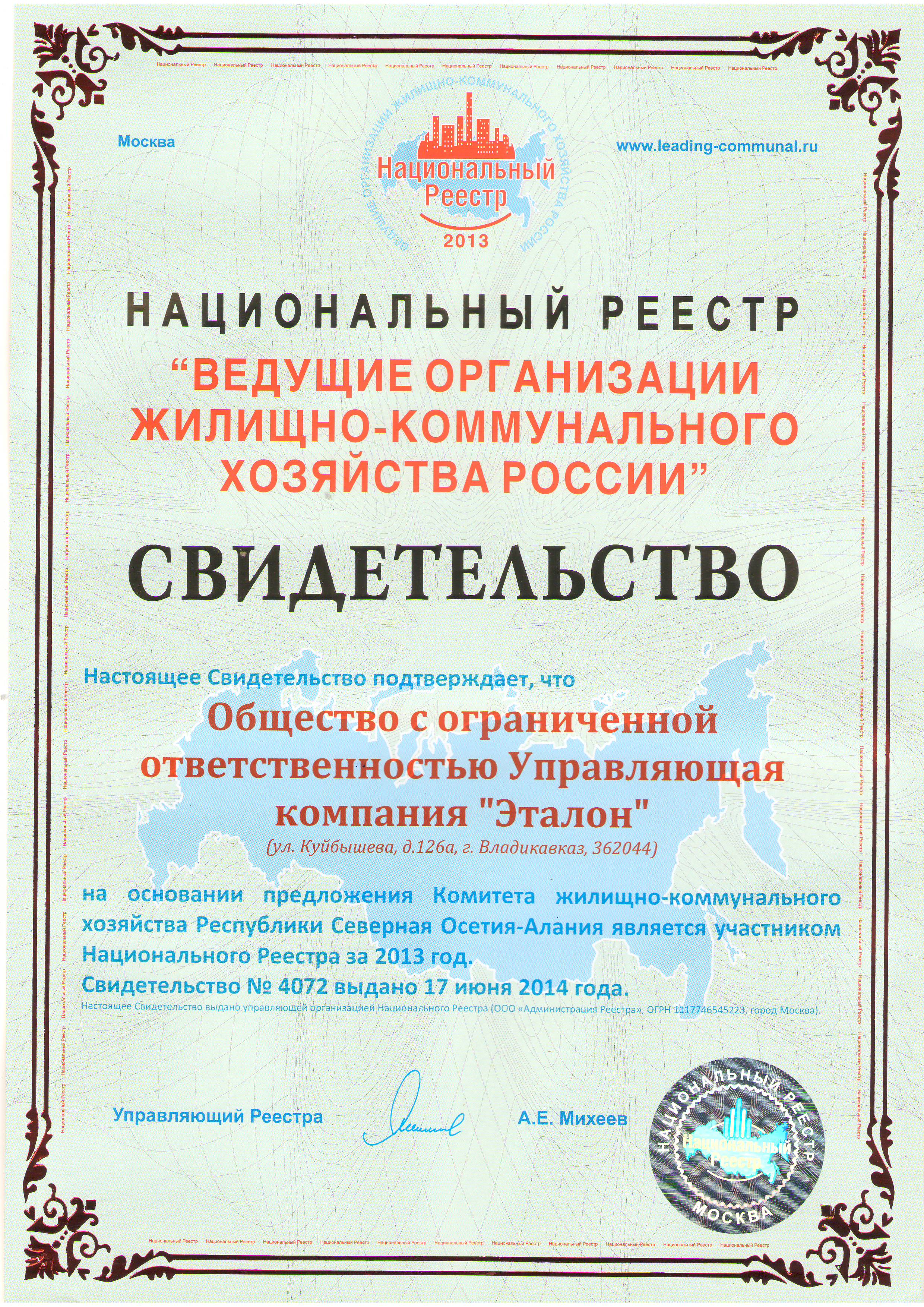 Июнь 2014 года – Общество с ограниченной ответственностью Управляющая компания «Эталон» на основании Комитета жилищно-коммунльного хозяйства Республики Северная Осетия - Алания, включено в Реестр ведущих организаций жилищно-коммунального комплекса за 2013 год.